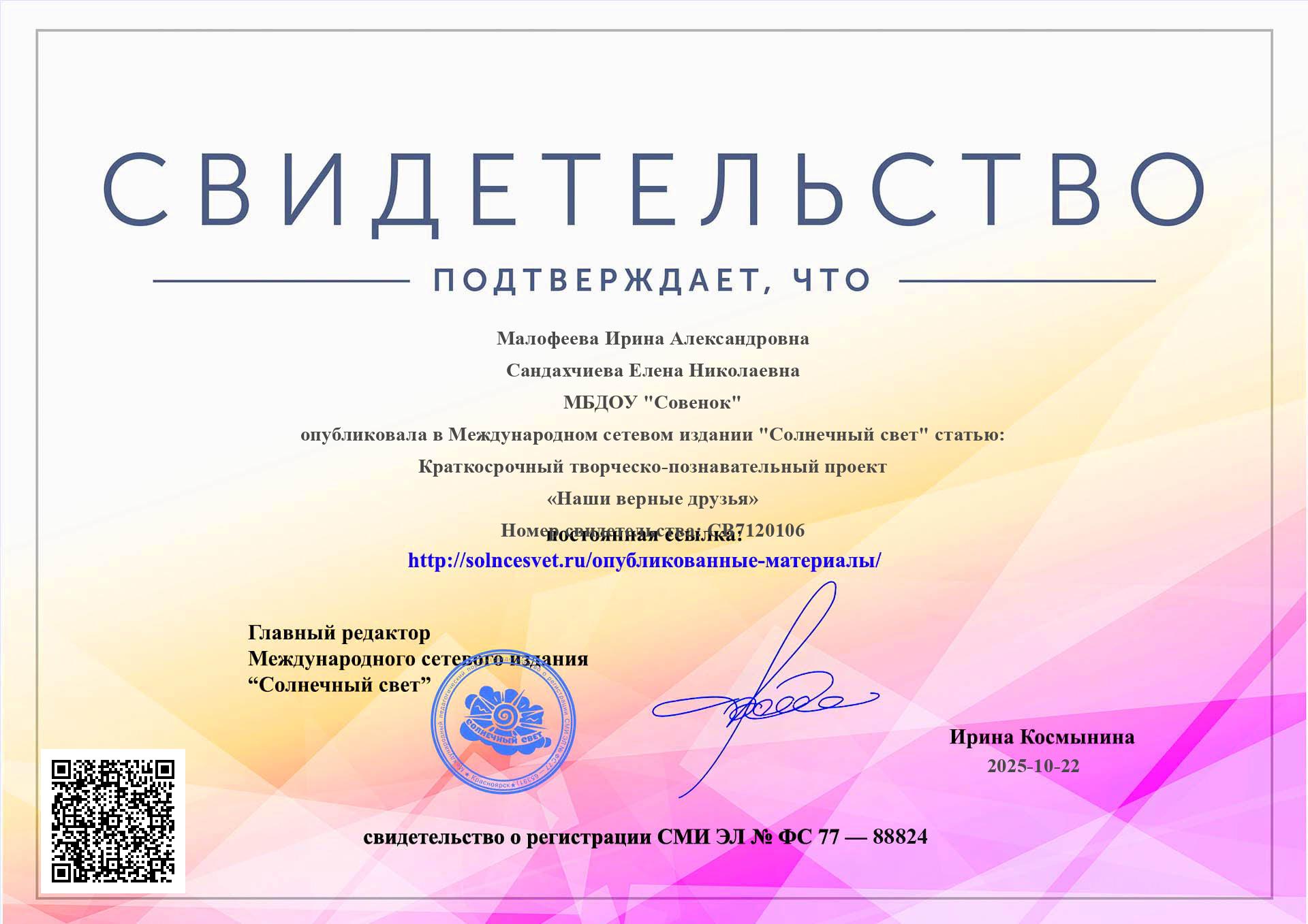 Свидетельство о публикации