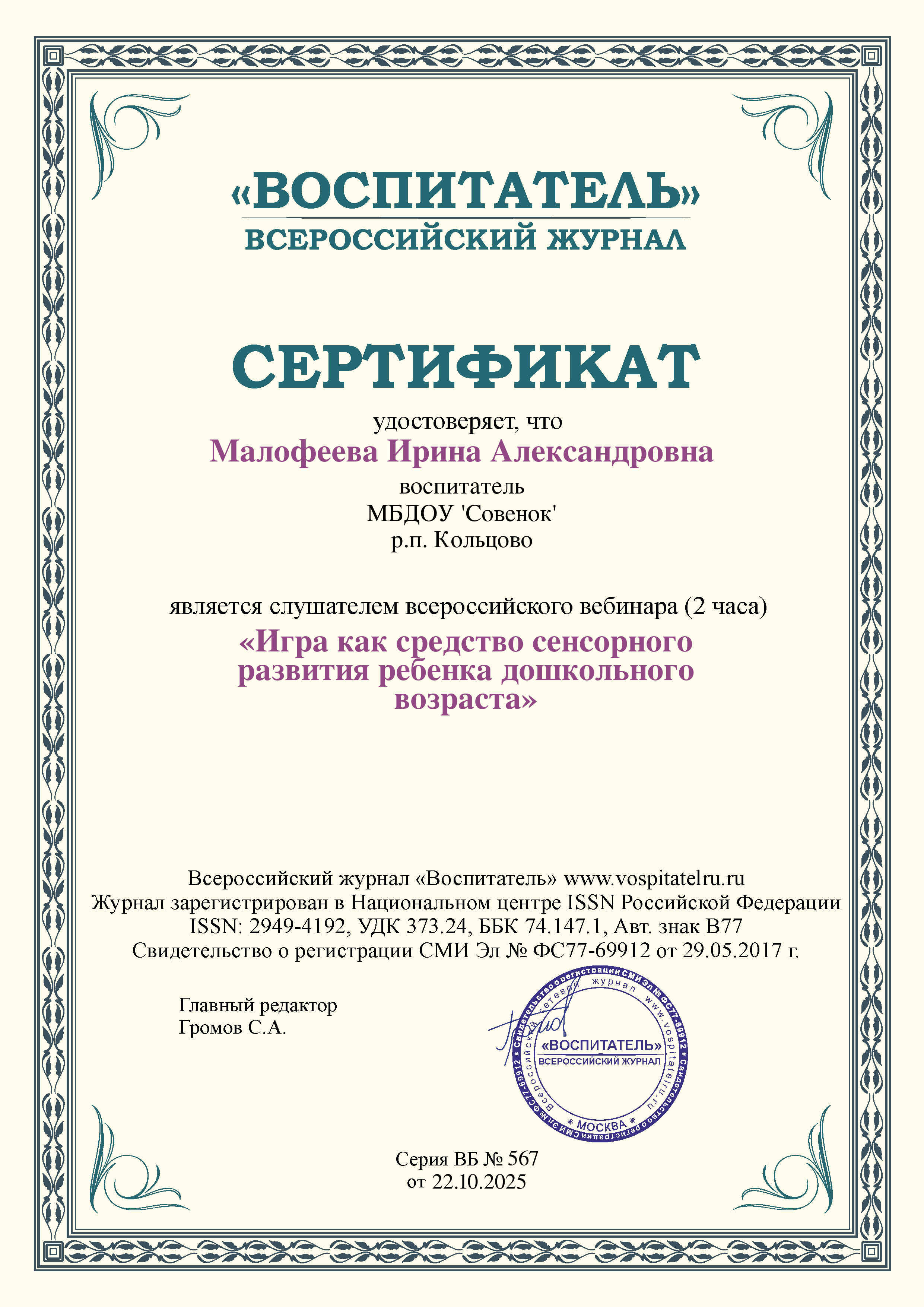 Сертификат Всероссийского вебинара "Организация игровой деятельности детей в условиях реализации ФГОС ДО"